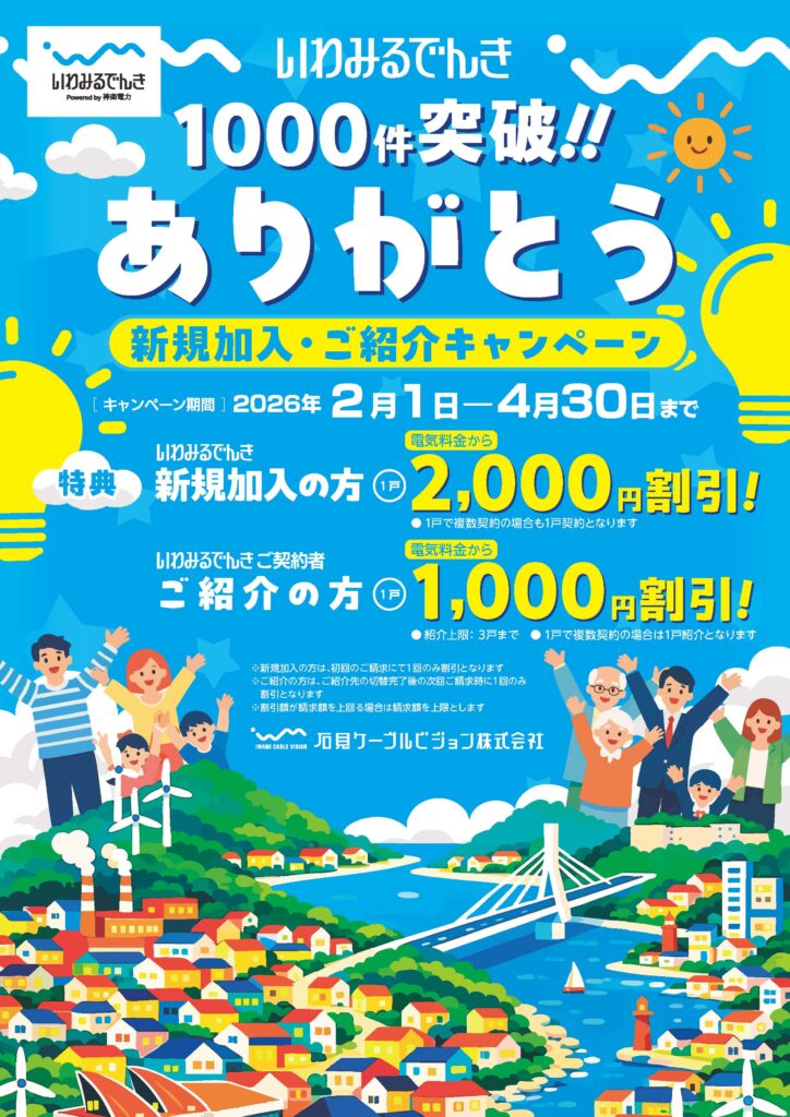 石見ケーブルビジョンでは、『いわみるでんき』ご加入者様1,000件突破を記念して、地域の皆様に感謝を込めた「新規加入・ご紹介キャンペーン」を実施中!